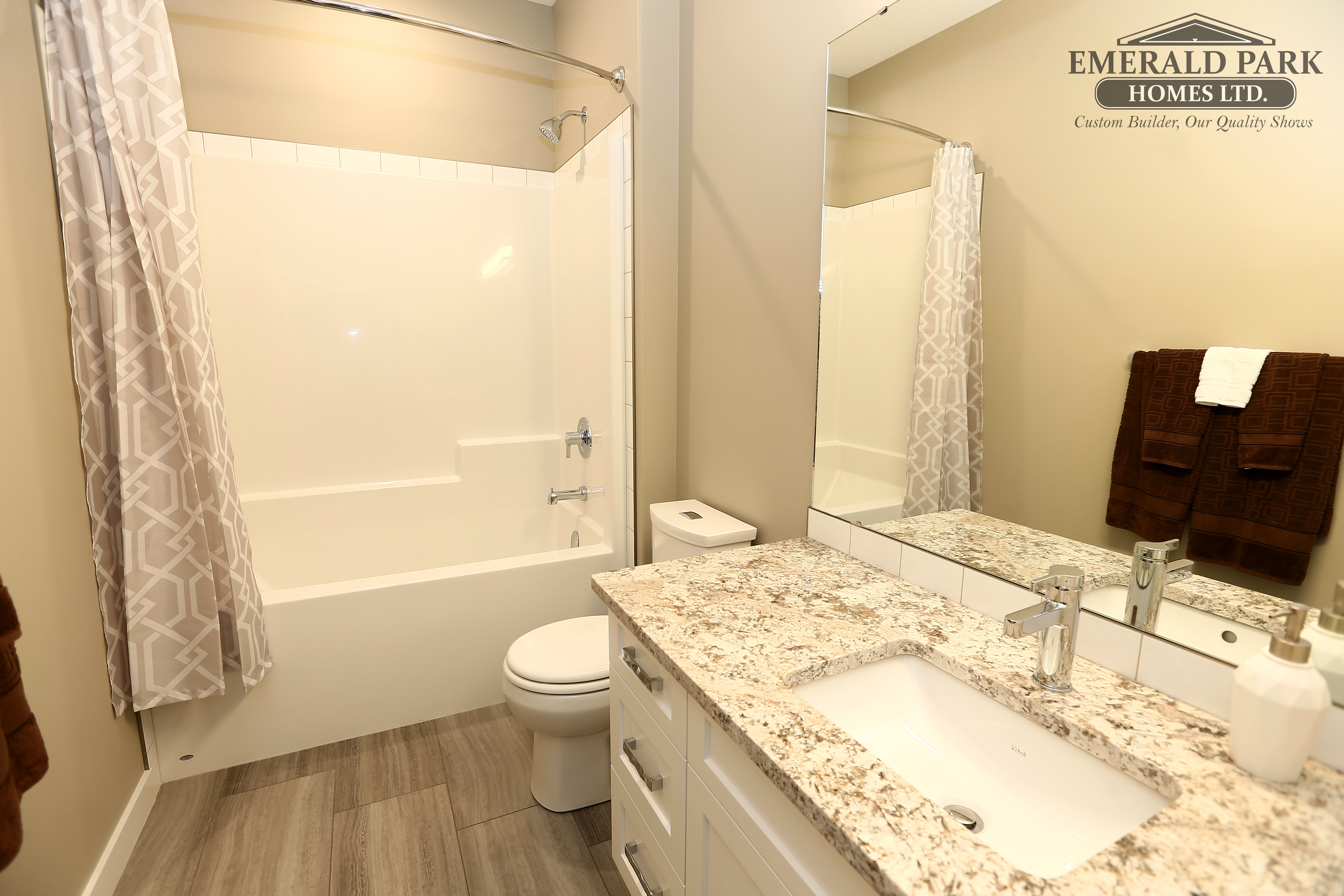 19 Emerald Hill Dr. show home for sale by emerald park homes white city walk out bungalow main floor four piece bathroom tub shower granite tops