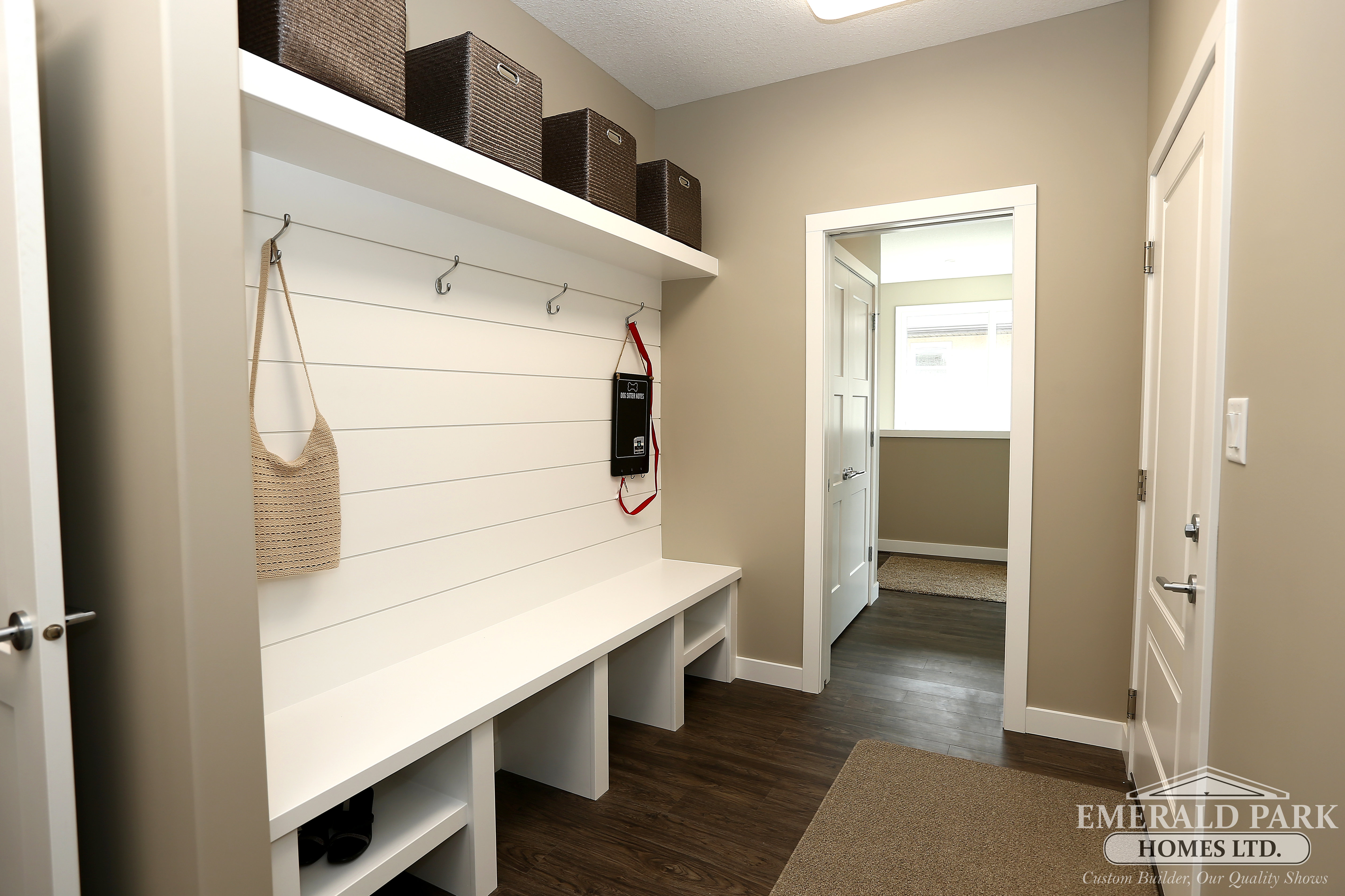 19 Emerald Hill Dr. show home for sale by emerald park homes white city walk out bungalow mudroom off garage storage lockers with bench and cubbies shared walk through laundry room