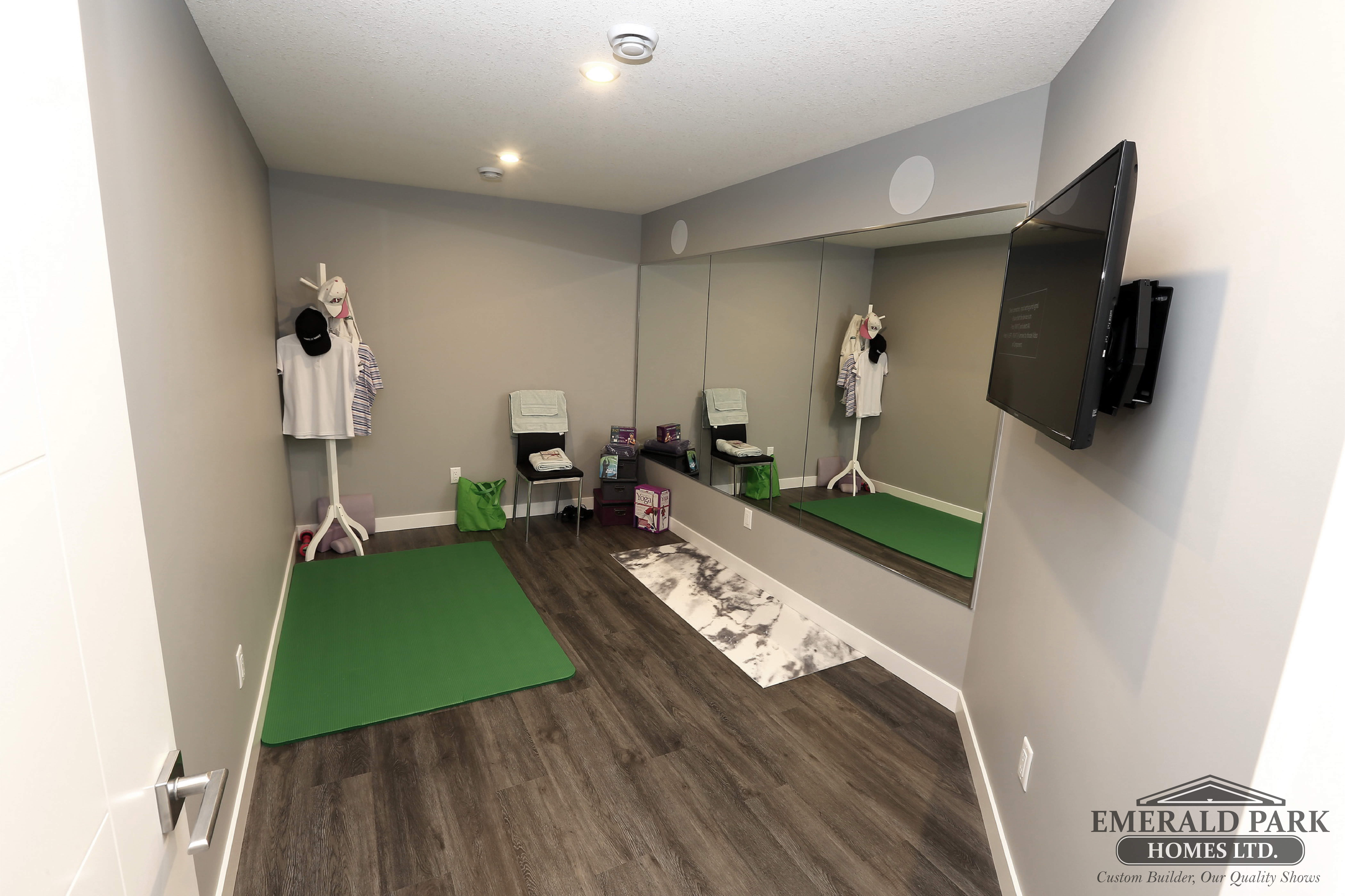 4414 Wolf Willow Pl – emerald park homes show home – basement home guym area mirror walls