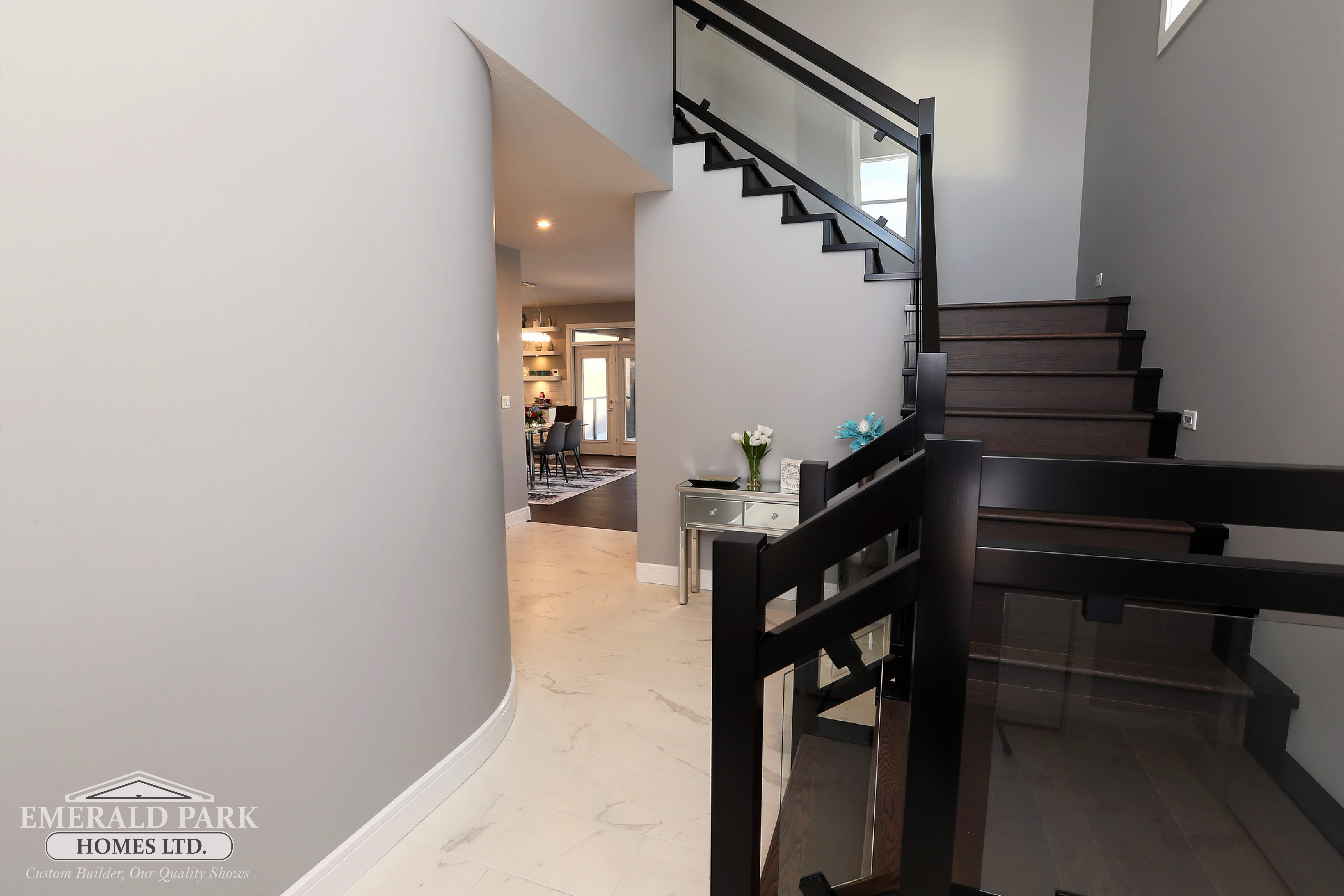 4414 Wolf Willow Pl – emerald park homes show home – grand staircase custom hardwood entrance