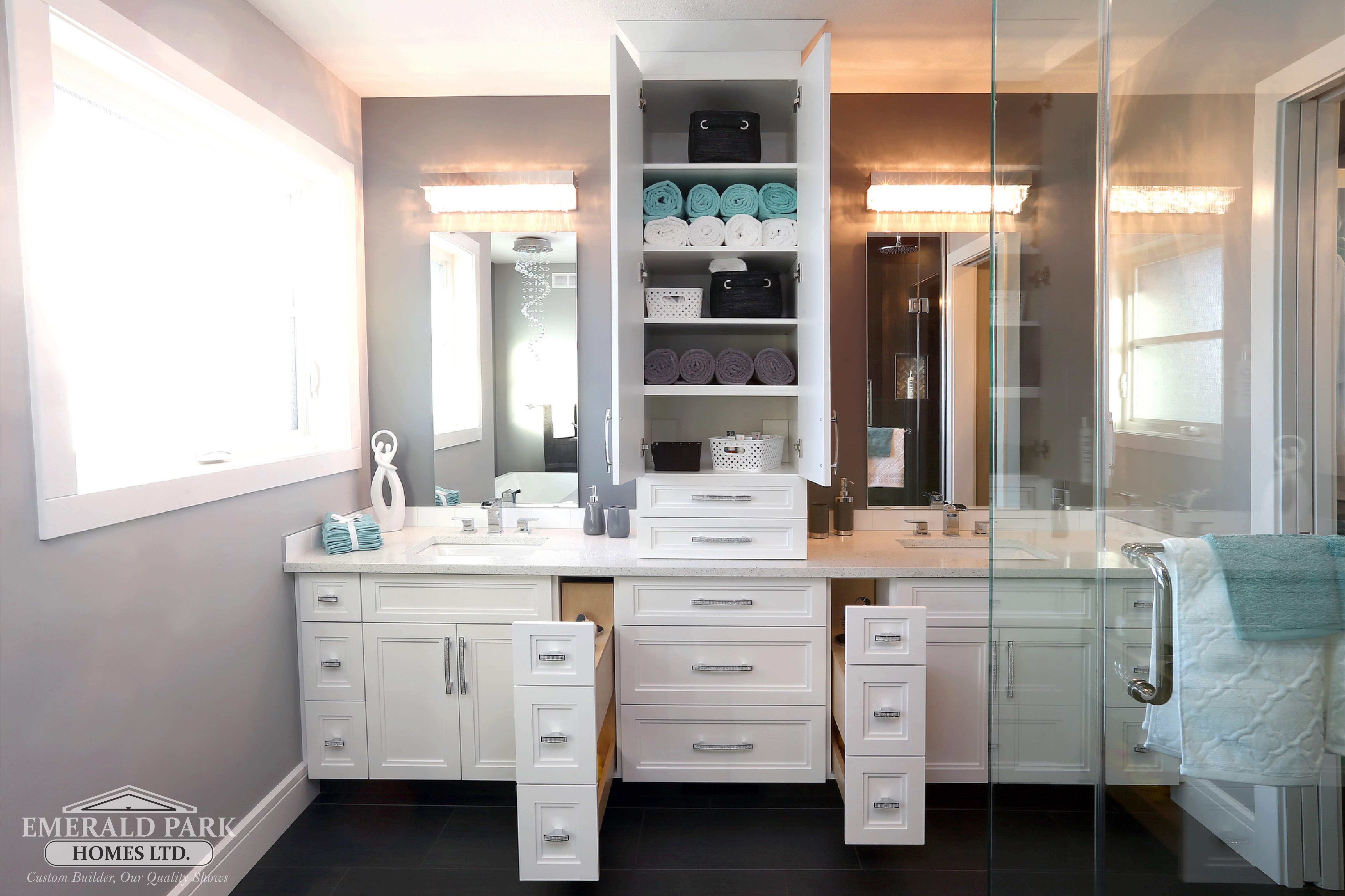 4414 Wolf Willow Pl – emerald park homes show home – master ensuite dual his hers vanities tower storage pull