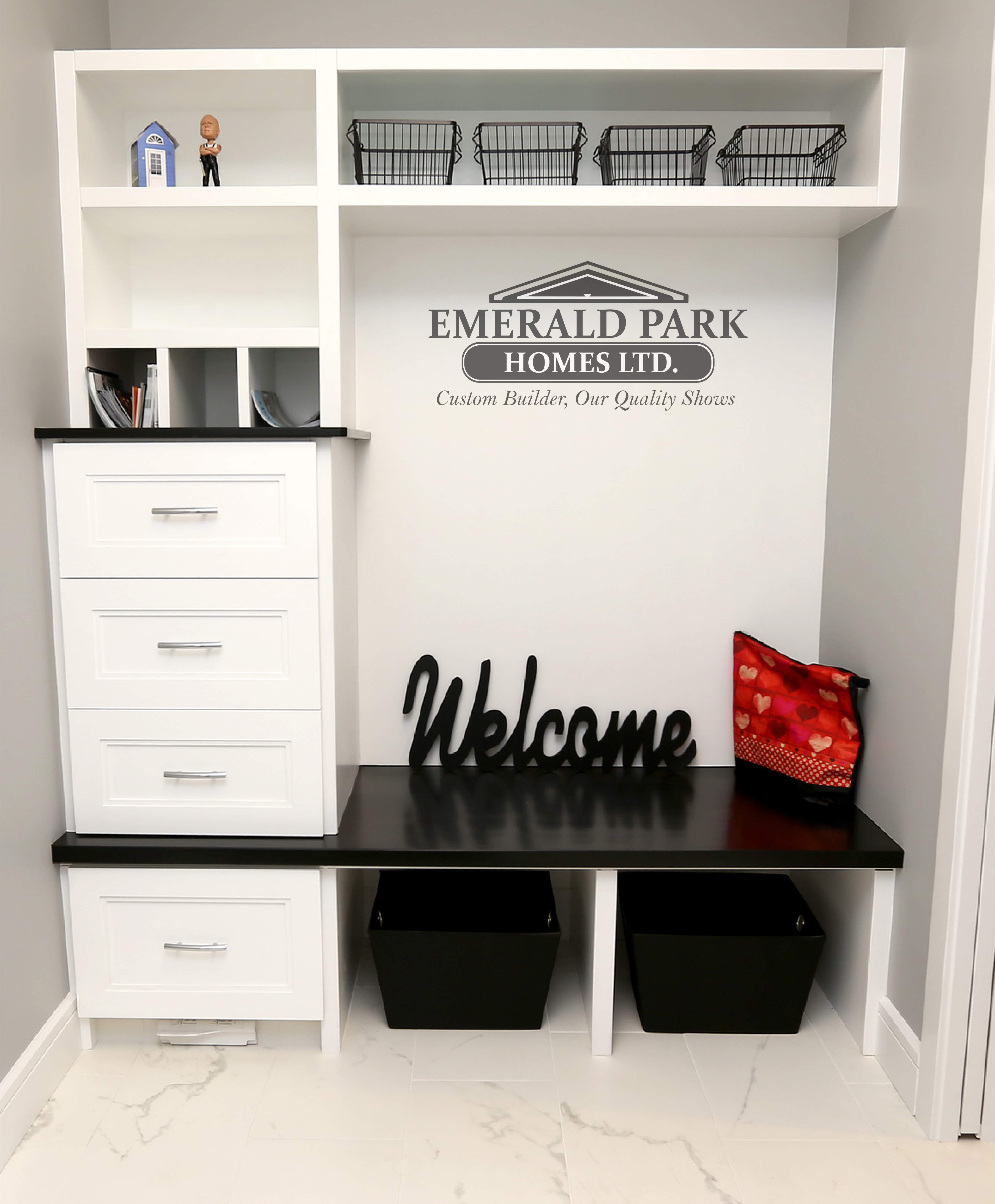 4414 Wolf Willow Pl – emerald park homes show home – mudroom off garage lockers drawers storage